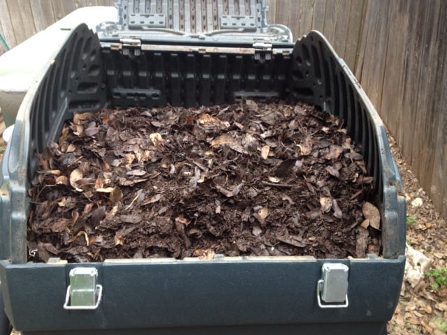 (Compost in a purchased bin that is well on its way to becoming nutrient rich humus.)